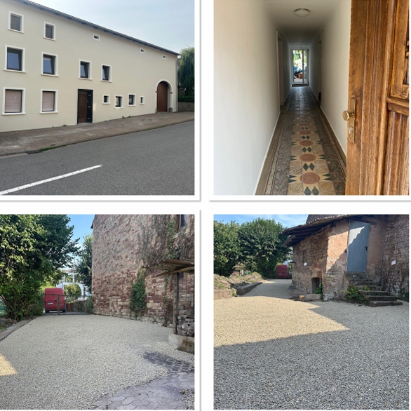 Das Haus umfasst zwei miteinander verbundene Wohneinheiten, mehrere Zugänge sowie großzügige Parkflächen (insgesamt bis zu 8 Stellplätze und Garage für 2–3 Fahrzeuge).